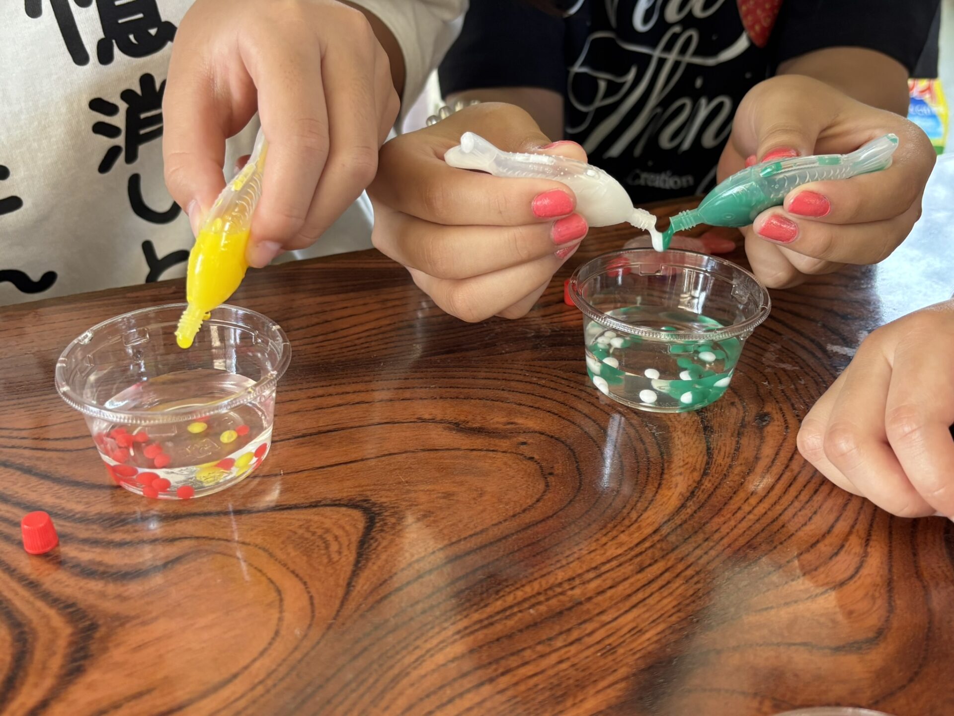 自由研究のテーマの決め方や進め方についても紹介。自分の好きを掘り下げて、検討材料を集めて考える、そんな自由研究を楽しんで欲しいと思います。“お楽しみ実験”として、カラフルな人工イクラづくりも実施し盛り上がりました。